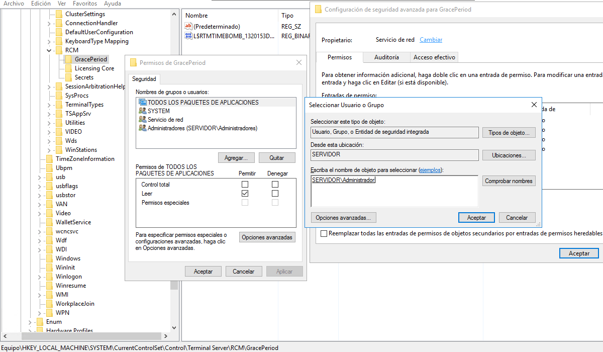 - Para extender la licencia cal wiindows server 2008, 2012 o 2016 asignar los privilegios lectura escritura a su usuario sobre la carpeta: GracePeriod (Carpeta hija de RCM).